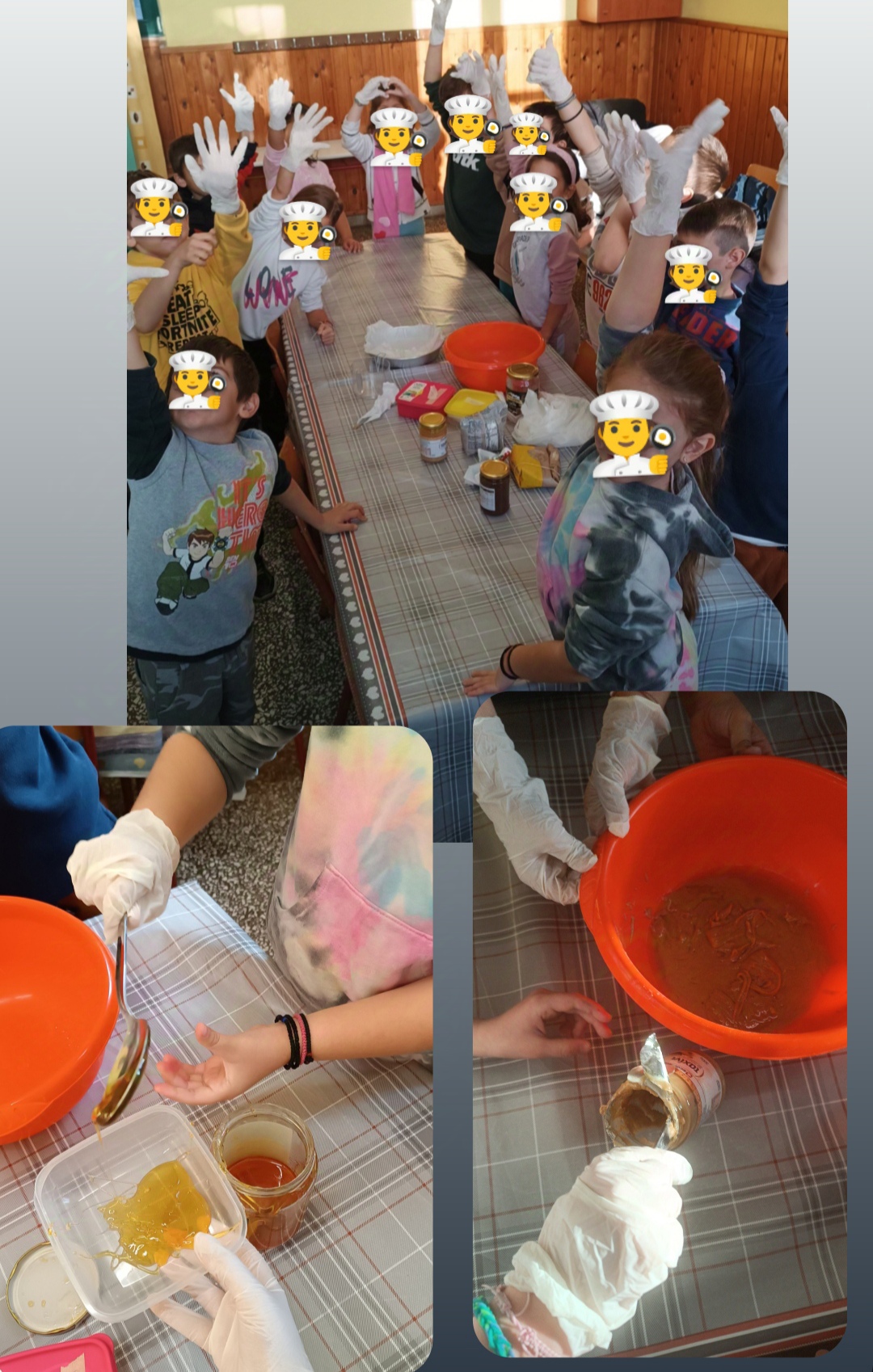 Οι μαθητές πρώτα έβαλαν το μέλι στο φούρνο μικροκυμάτων για να ρευστοποιηθεί και έπειτα το βάλανε σε ένα μπολ μαζί το ταχίνι (και το ταχίνι με σοκολάτα) και το ανακατέψαν πολύ καλά. Μετά, ρίξανε τη βρόμη, τα δημητριακά και τα κράνμπερι και ανακατέψαν πολύ καλά το μείγμα με το κουτάλι αλλά και με τα χεράκια τους (φορώντας τα γάντια μιας χρήσης).Κατόπιν, έβαλαν σε ένα ταψί λαδόκολλά και τοποθετήσαν το μείγμα. Προσπάθησαν να το απλώσουν ομοιόμορφα και βάλανε το ταψί στο ψυγείο για να κρυώσουν οι μπάρες.