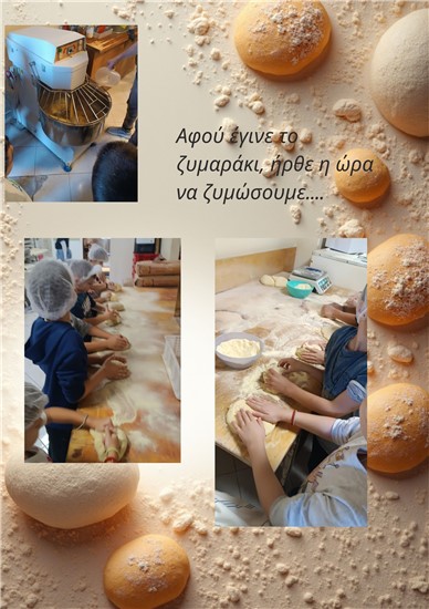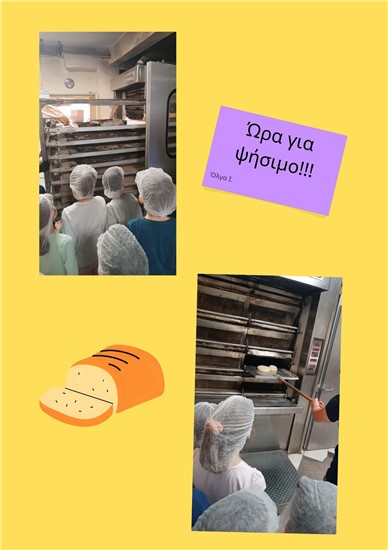 Μας έδειξαν οι ιδιοκτήτες και οι υπάλληλοι του αρτοποιείου το φούρνο και τον τρόπο όπου τοποθετούν τα ψωμιά καθώς και το πως τα αφαιρούν από αυτόν. Οι μαθητές και οι μαθήτριες κατάλαβαν τη διαδικασία παρασκευής ψωμιού και έμαθαν τα στάδια όπου ακολουθούνται μέχρι να φτάσει το ψωμί στο σπίτι μας.