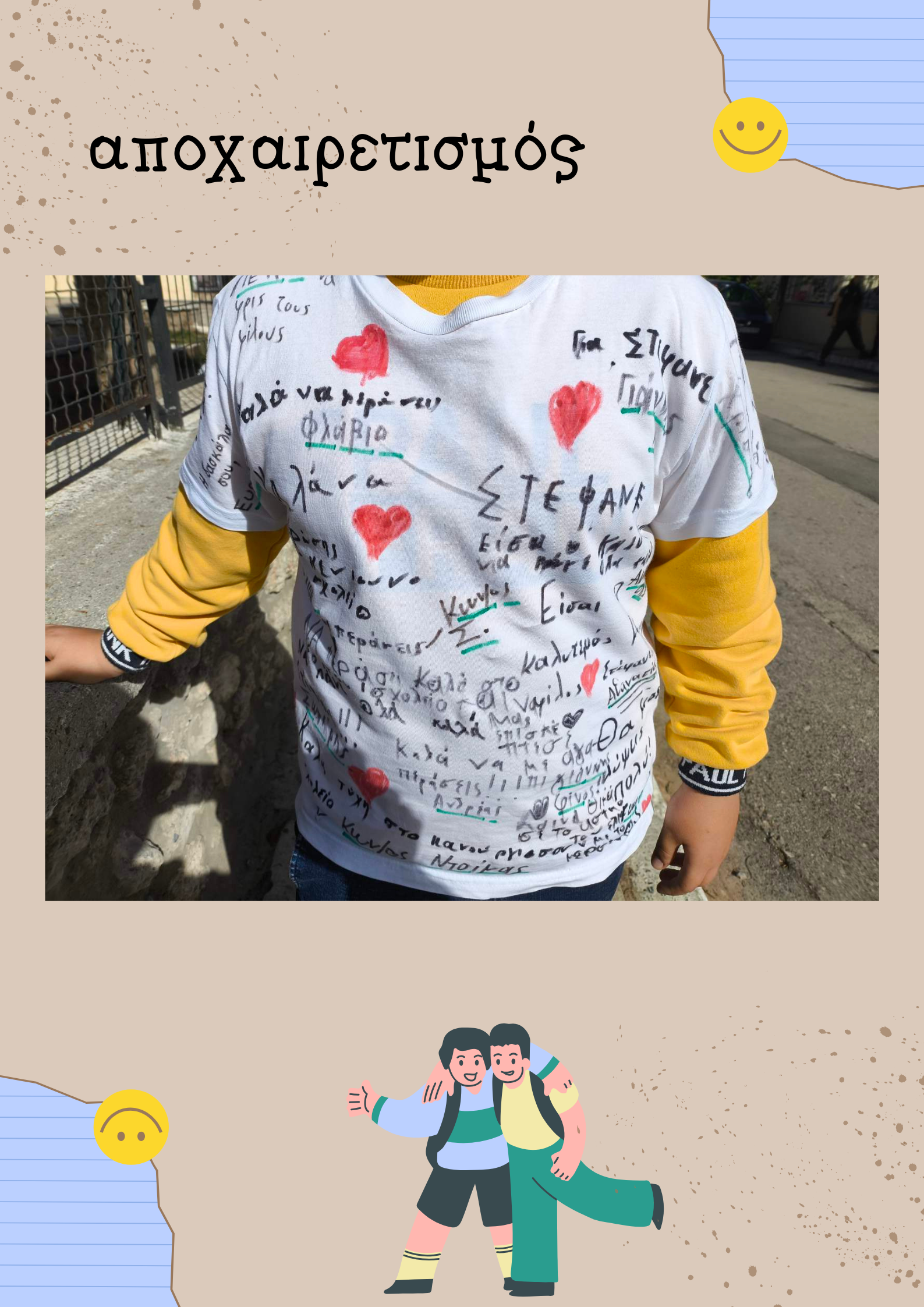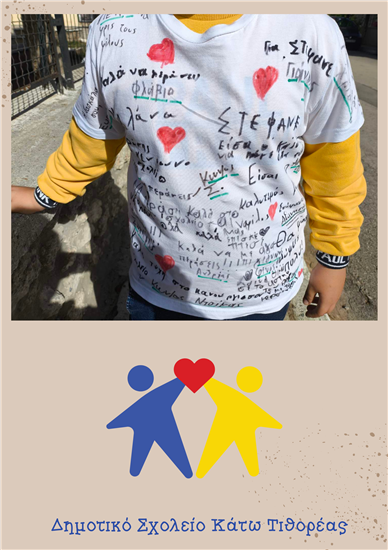 Ως ενθύμιο της φιλίας και των όμορφων στιγμών που μοιράστηκαν, τα παιδιά ζωγράφισαν πάνω σε μία μπλούζα πολύχρωμες ζωγραφιές και έγραψαν εγκάρδιες ευχές, δημιουργώντας ένα ξεχωριστό αναμνηστικό γεμάτο αγάπη και συναισθήματα.