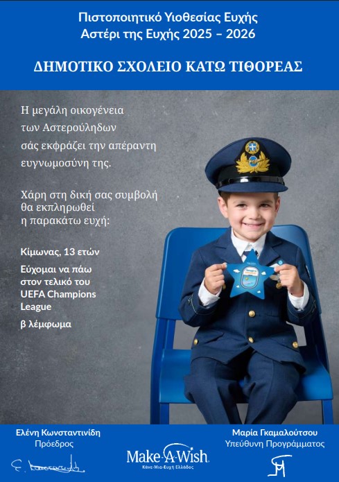 Θα θέλαμε να σας ευχαριστήσουμε για την πολύτιμη στήριξή σας στο πρόγραμμα Αστέρι της Ευχής κατά το σχολικό έτος 2025-2026. Με τη δωρεά σας συμμετέχετε και εσείς ώστε να εκπληρωθούν ευχές παιδιών που πάσχουν από σοβαρές για τη ζωή τους ασθένειες.