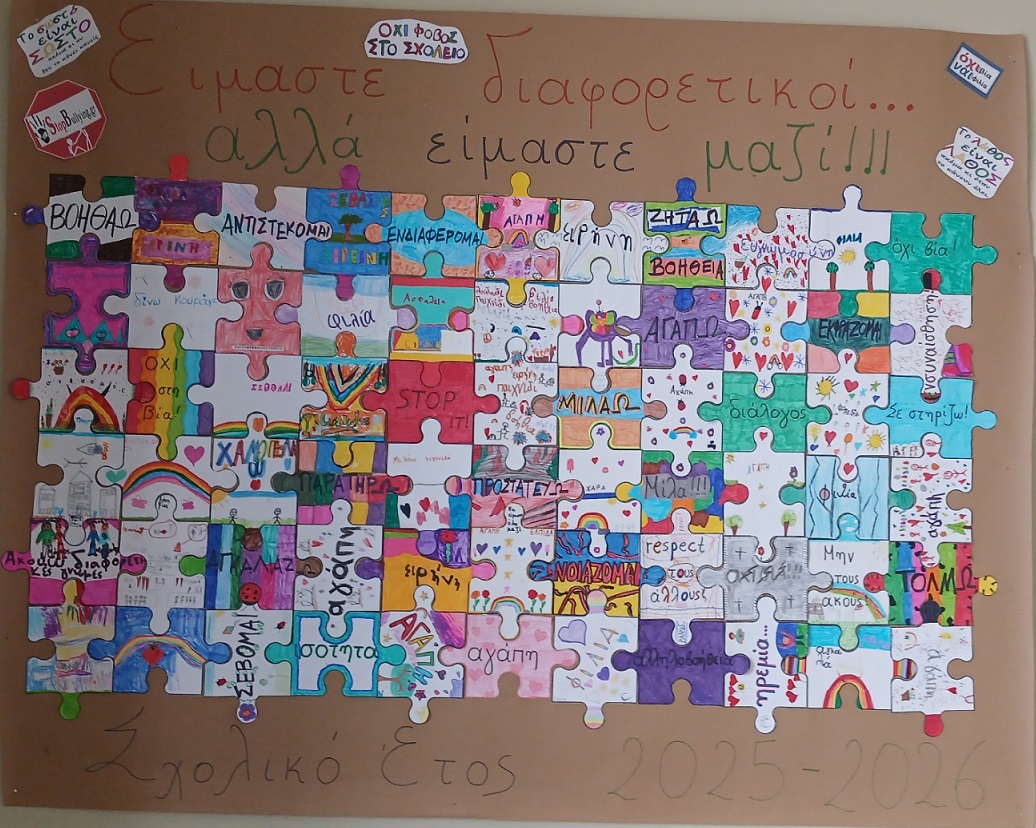 Όλοι οι μαθητές και οι μαθήτριες συμμετείχαν ενεργά, στέλνοντας το δικό τους μήνυμα μέσα από τη δημιουργικότητα και τη συνεργασία. Ο καθένας ζωγράφισε το δικό του κομμάτι παζλ, εκφράζοντας σκέψεις και συναισθήματα γύρω από τη φιλία, τον σεβασμό και την αποδοχή της διαφορετικότητας.