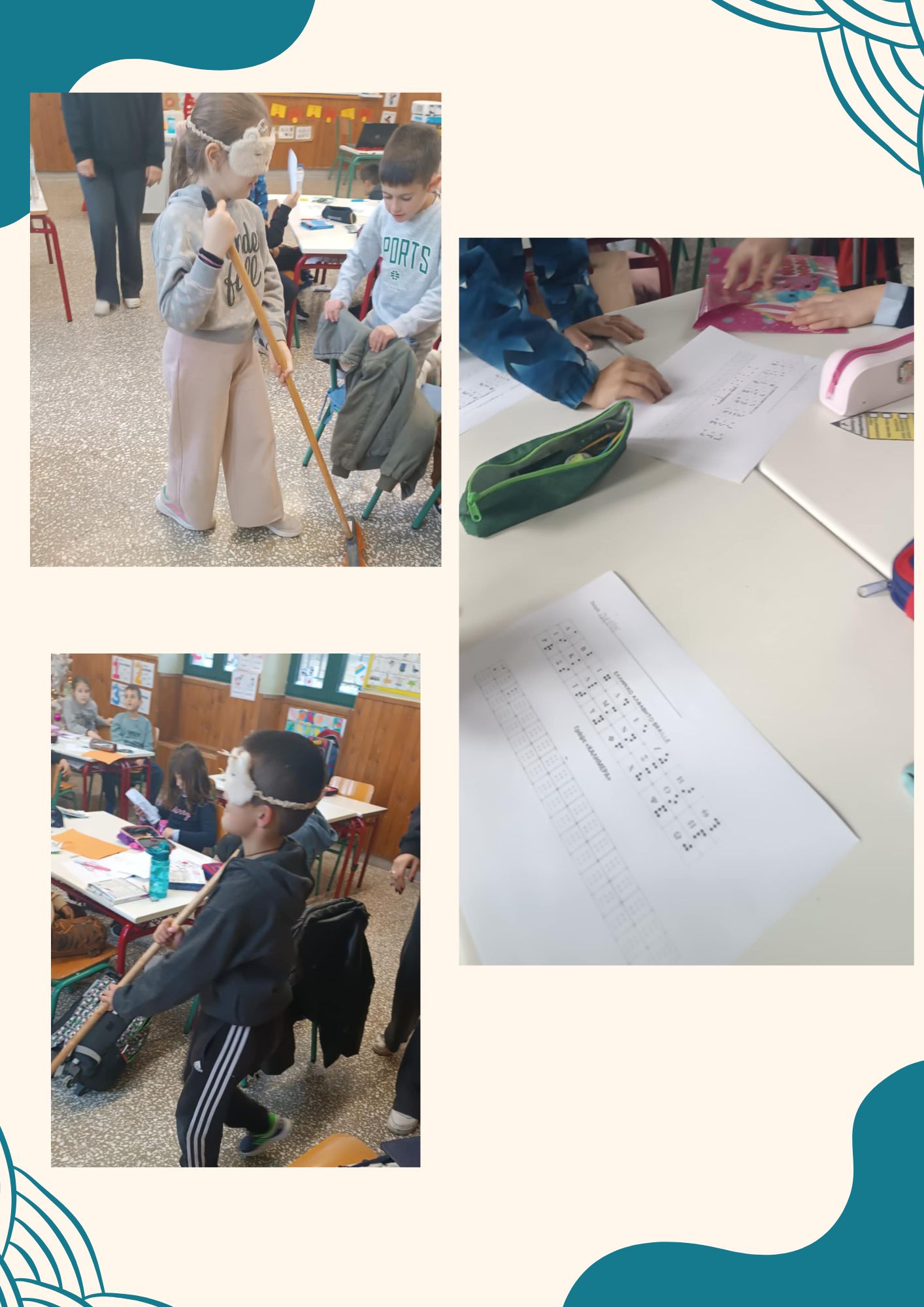 Προηγήθηκε συζήτηση και καταιγισμός ιδεών σχετικά με τον όρο αναπηρία, και έγινε αναφορά στα είδη της αναπηρίας που είναι η αισθητηριακή (τύφλωση, κώφωση), η κινητική και η νοητική. Ακόμη, μιλήσαμε για τη ζωή των ανθρώπων με οπτική αναπηρία, για τα προβλήματα που τυχόν αντιμετωπίζουν αλλά και για το πως διαβάζουν ένα κείμενο. Οι μαθητές της Β΄ τάξη ψηλάφισαν ένα κείμενο γραμμένο στη Braille που είναι η γραφή των τυφλών. Μπήκανε στη θέση των ατόμων με τύφλωση καθώς με τη βοήθεια μιας μάσκας, έκλεισαν τα μάτια τους και προσπαθήσανε να περπατήσουν μέσα αλλά και έξω από την τάξη, έχοντας έναν συμμαθητή μας για βοηθό ή ένα σκουπόξυλο. Ακόμη, τους ζητήθηκε να γράψουν το όνομά τους με κλειστά μάτια και έπειτα να γράψουν τη λέξη «ΚΑΛΗΜΕΡΑ» χρησιμοποιώντας το σύστημα-αλφάβητο της γραφής Braille, δηλαδή σχηματίζοντας κουκίδες με το μολύβι τους. Επίσης, συζητήσαμε για τη ζωή των ατόμων που δεν έχουν κάποιο μέλος του σώματός τους και συγκεκριμένα τα χέρια. Οι μαθητές μπήκαν στη θέση αυτών καθώς κλήθηκαν να ζωγραφίσουν χωρίς χέρια, χρησιμοποιώντας αρχικά το στόμα τους και μετέπειτα χρησιμοποιώντας το αντίθετο χέρι με αυτό που γράφουν να γράψουν το όνομα τους.