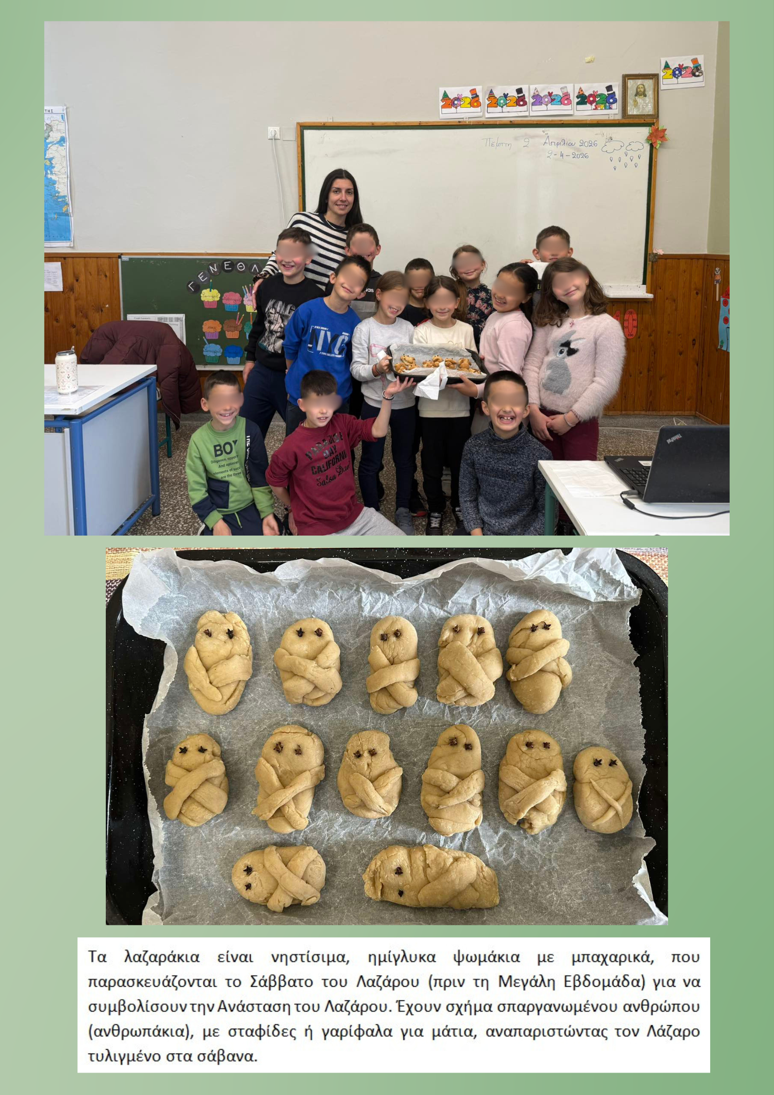 Αφού η τάξη μας τη μια μέρα μύρισε γαρύφαλλο με τα μυρωδάτα πορτοκάλια, έφτασε η σειρά της κανέλας. Έτσι , τα παιδιά ζύμωσαν και έπλασαν τα γνωστά σε όλους «Λαζαράκια». Να πούμε ένα μεγάλο ευχαριστώ στην κα Αργυρώ από το κυλικείο που μας βοήθησε με το ψήσιμο. Επιπλέον, έφτιαξαν χειροποίητες πασχαλινές κάρτες για να τις προσφέρουν σε αγαπημένα τους πρόσωπα. Τέλος, έπαιξαν σε ομάδες το παιχνίδι των «Κρυμμένων αυγών» μέσα στην τάξη (εδώ… μας τα χάλασε λίγο ο καιρός) διασκεδάζοντας πολύ.