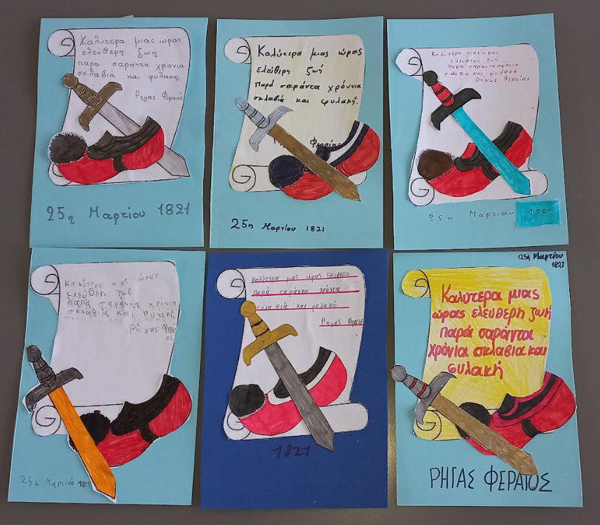 Με αφορμή τη διπλή γιορτή της 25ης Μαρτίου οι μαθητές της Δ΄ τάξης έμαθαν για τον Ευαγγελισμό της Θεοτόκου και την Ελληνική Επανάσταση του 1821. Γνώρισαν τους αγωνιστές του 1821 θαυμάζοντας τον ηρωισμό με τον οποίο αγωνίστηκαν για την απελευθέρωση της Ελλάδας.
