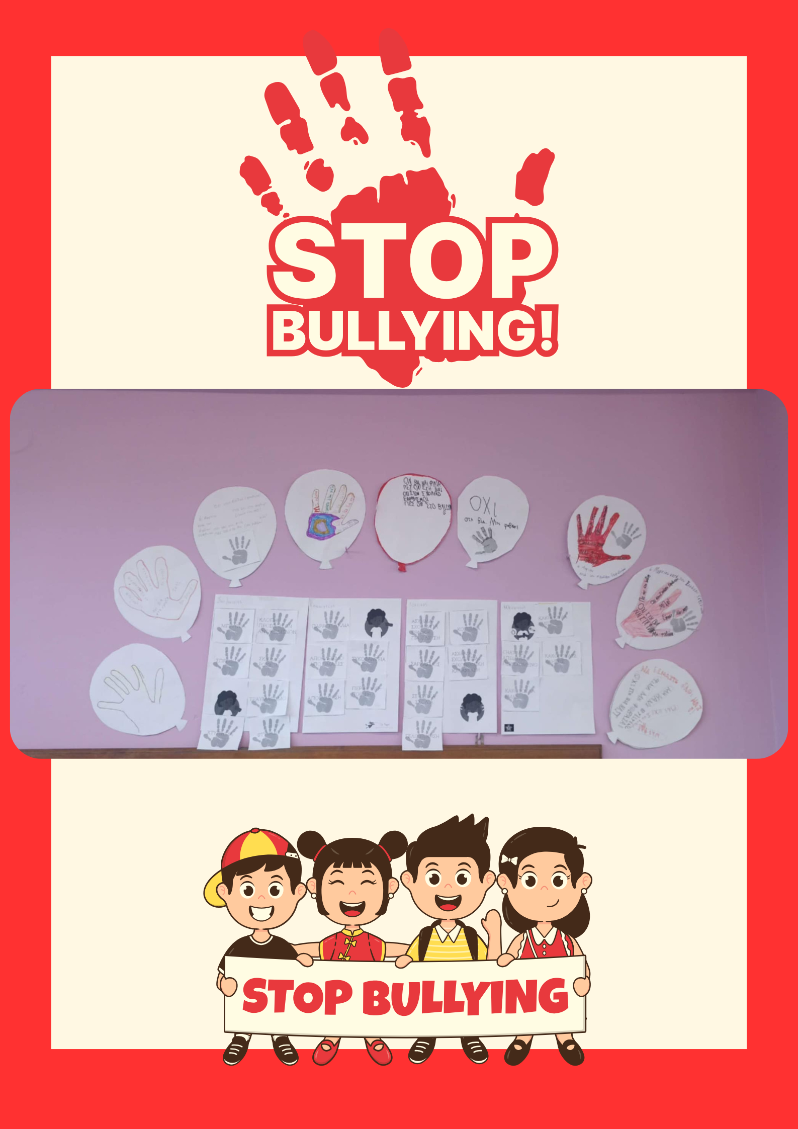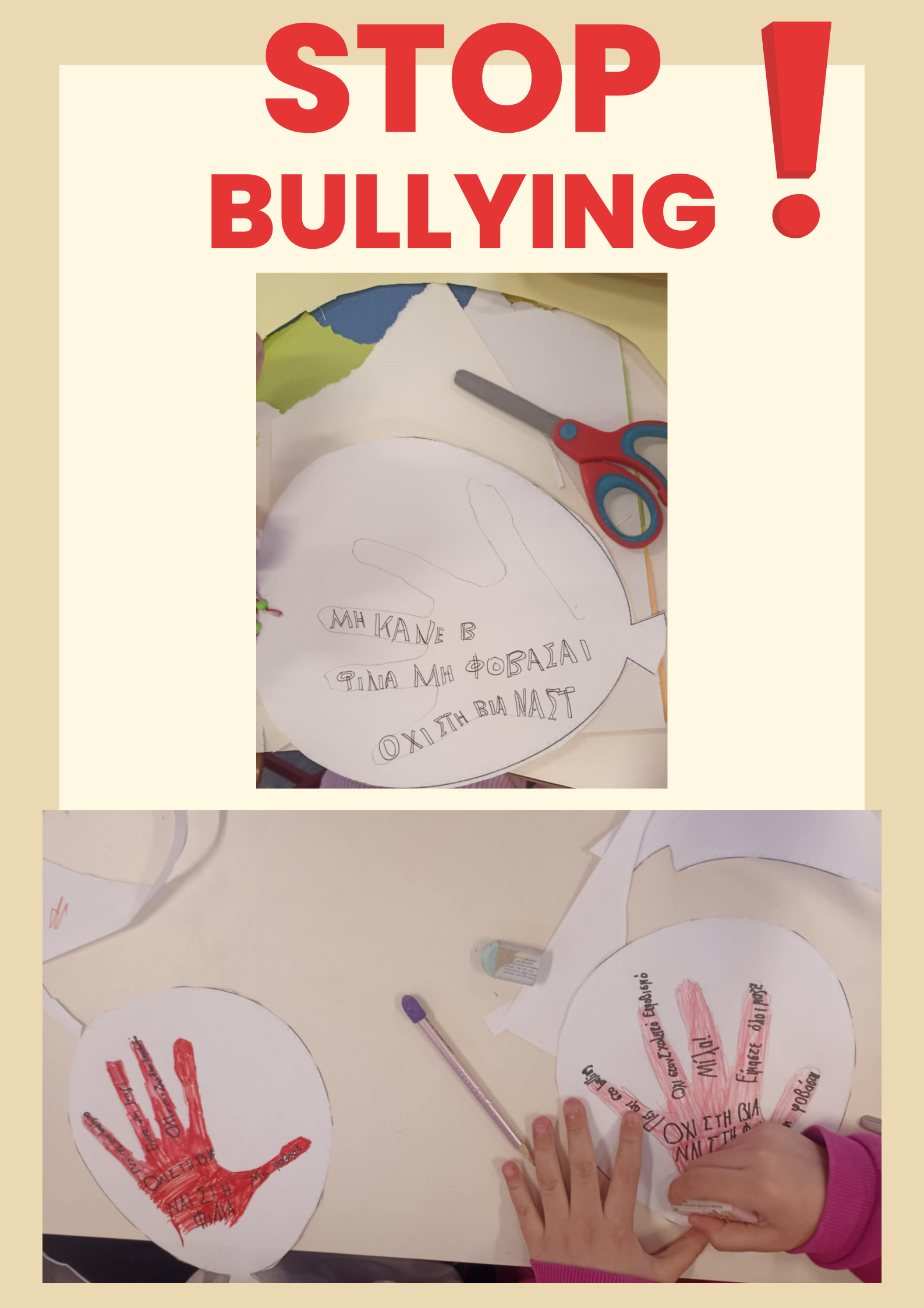Οι μαθητές/τριες της Δ' Τάξης συζήτησαν για τη σχολική βία, με αφορμή την Πανελλήνια Ημέρα κατά του Σχολικού Εκφοβισμού. Αρχικά, μίλησαν για τον ορισμό του σχολικού εκφοβισμού, για τις τέσσερις μορφές του (λεκτικός, σωματικός, κοινωνικός και ηλεκτρονικός εκφοβισμός), για τις αιτίες του φαινομένου, αλλά και για τον τρόπο αντιμετώπισής του. Επίσης, παρακολούθησαν βίντεο που εξηγούν τις μορφές του σχολικού εκφοβισμού και δημιούργησαν σχετικό κολάζ. Ειδικότερα, οι τεσσερις κατηγορίες εκφοβισμού ήταν αναρτημένες στον πίνακα και κάθε παιδί είχε από δύο καρτελάκια που αναγράφουν παραδείγματα εκφοβισμού. Έτσι, ο/η κάθε μαθητής/ρια καλούνταν να κολλήσει τα καρτελάκια του στη σωστή κατηγορία.