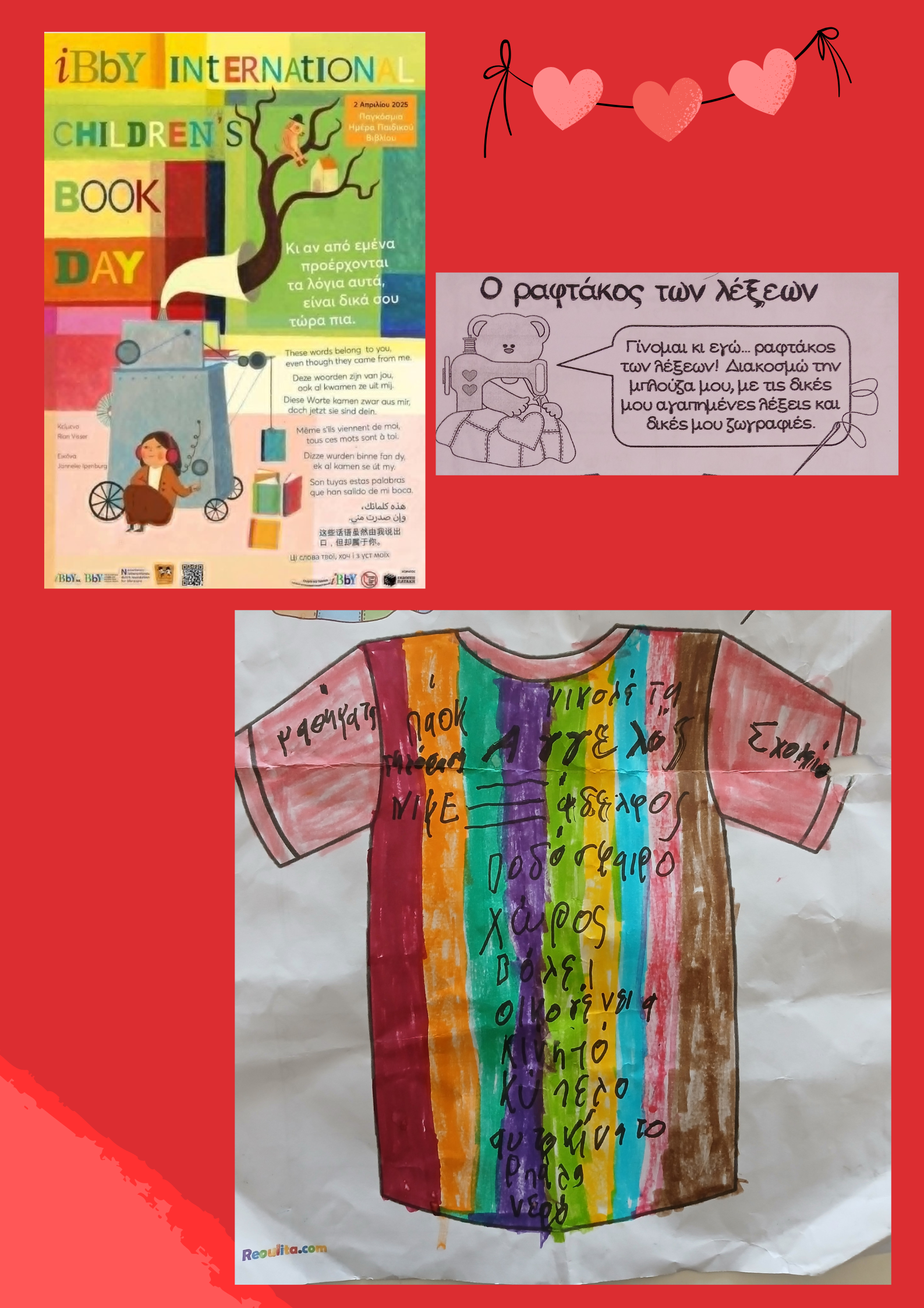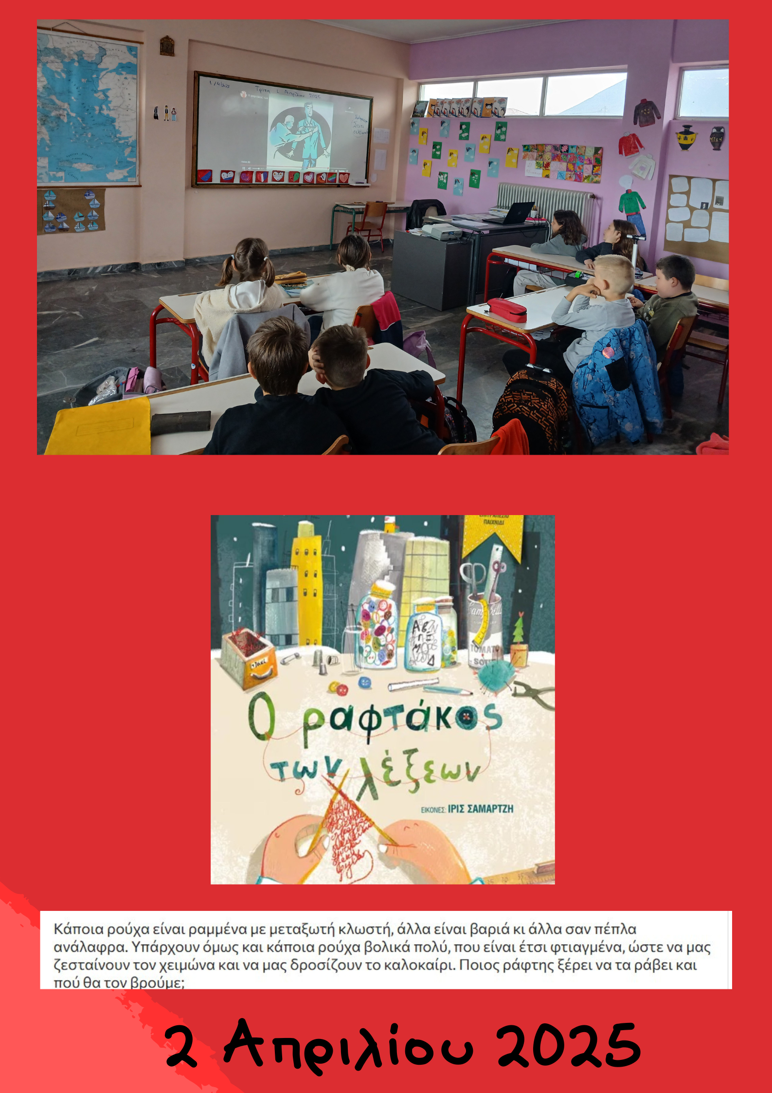 Με αφορμή την Παγκόσμια Ημέρα Παιδικού Βιβλίου μιλήσαμε αρχικά για τον Hans Christian Andersen. Πού γεννήθηκε, πώς μεγάλωσε, πού ταξίδεψε και ποια παραμύθια του γνωρίζουμε. Έπειτα αναφερθήκαμε στο βιβλίο: Ο ραφτάκος των λέξεων όπου οι μαθητές το απόλαυσαν σε μια διαδικτυακή αφήγηση. «Ο Ραφτάκος των λέξεων», έχει κερδίσει τις καρδιές μικρών και μεγάλων, τρυφερό και επίκαιρο όσο ποτέ, μιλά για την αγάπη, για τη δύναμη των λέξεων, για την ανάγκη της ανθρώπινης επικοινωνίας, την παρηγοριά και τη ζεστασιά που προσφέρει ο ανθρώπινος λόγος. Στο τέλος ζωγράφισαν-ράψανε τη δική τους μπλούζα με γράμματα και λέξεις!