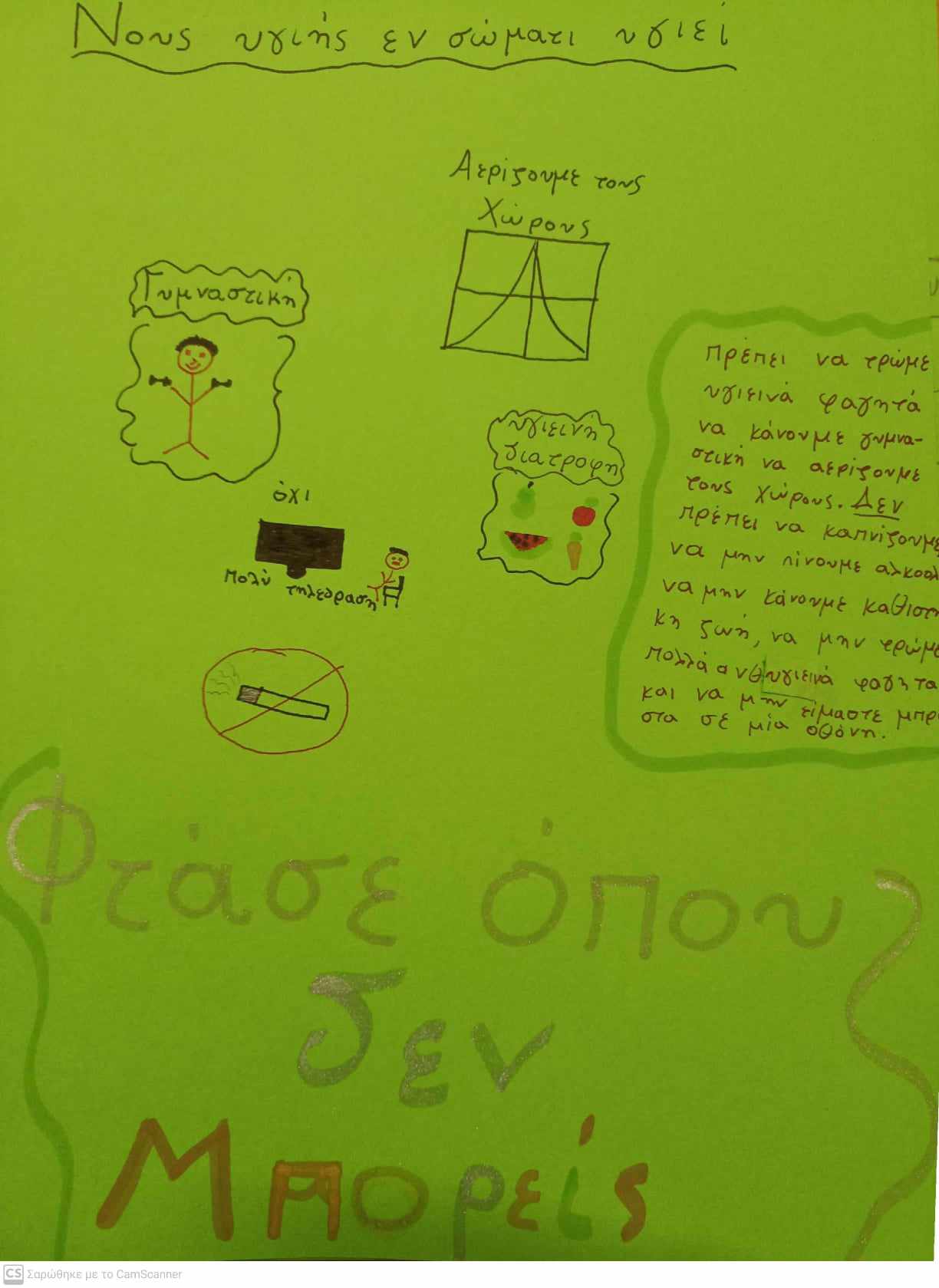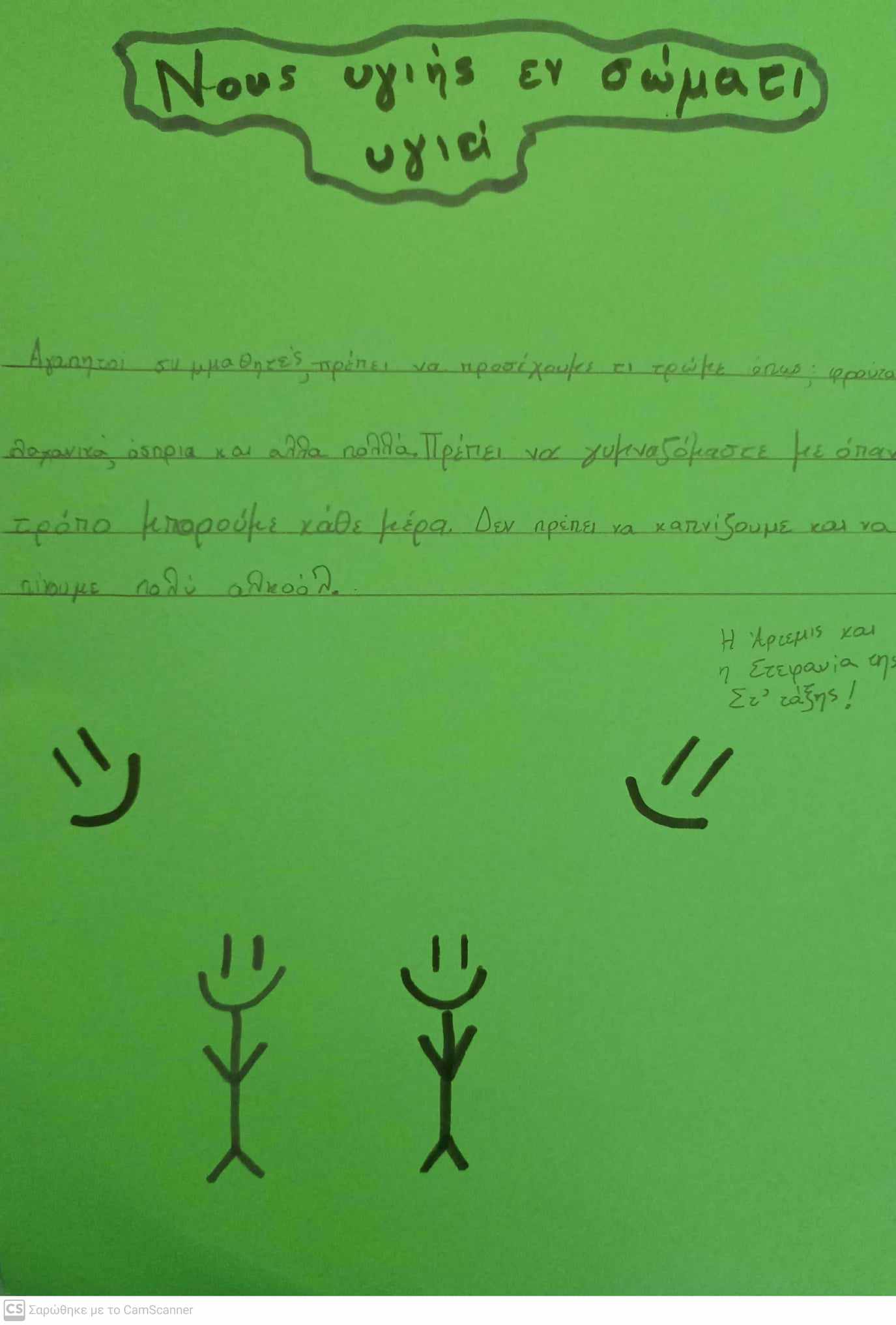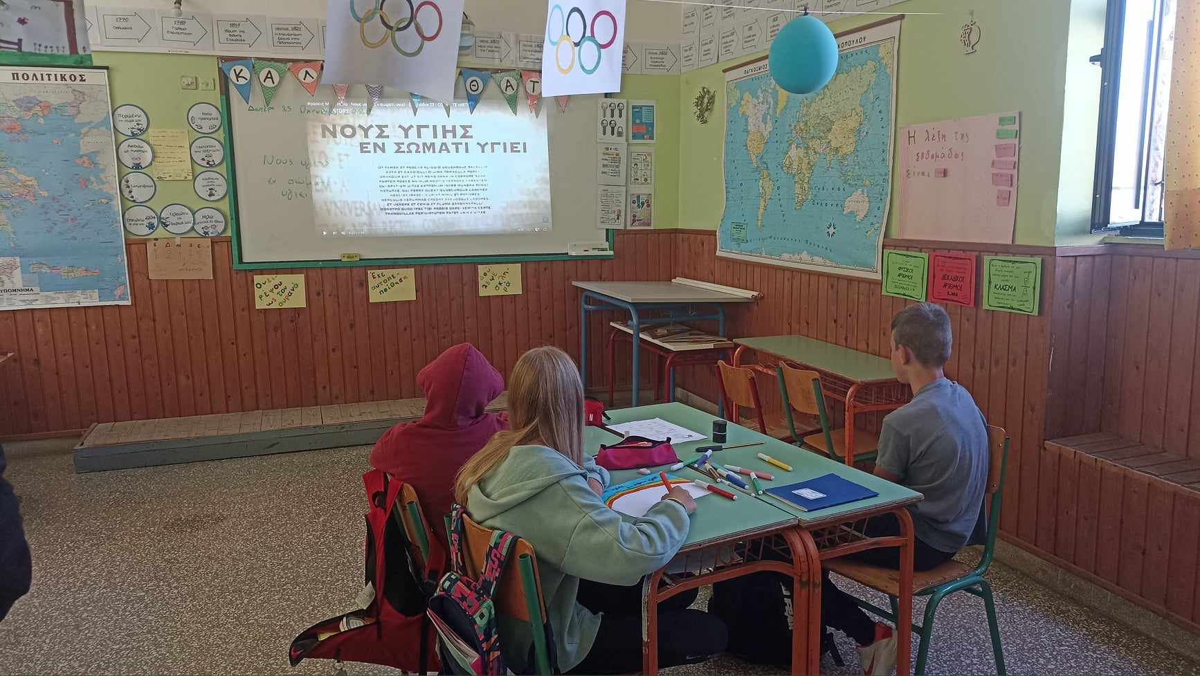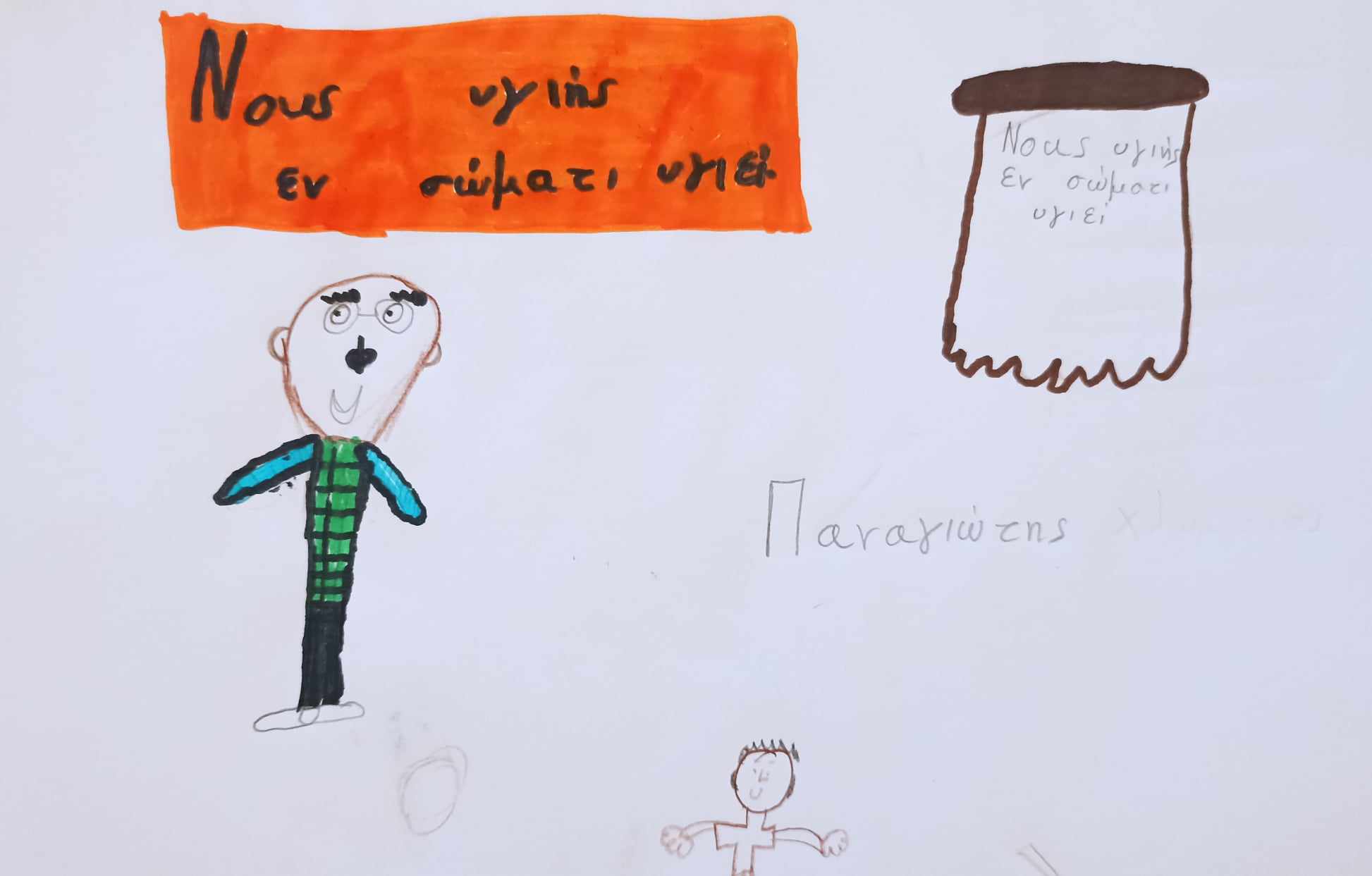Στο πρώτο Εργαστήριο με τίτλο: "Νους υγιής εν σώματι υγιεί", οι μαθητές/ριες της Στ' τάξης είχαν την ευκαιρία να γνωρίσουν το ανθρώπινο σώμα και να συζητήσουν για τη σημασία της σωματικής και ψυχικής υγείας. Αρχικά, παρακολούθησαν βίντεο σχετικά με τη σωστή λειτουργία της καρδιάς και με τα οφέλη της σωματικής άσκησης. Στη συνέχεια, ζωγράφισαν το εσωτερικό του ανθρώπινου σώματος και έμαθαν τα ονόματα των βασικότερων οργάνων. Επίσης, ταξίδεψαν στην Αρχαία Ελλάδα για να κατανοήσουν τη σύνδεση της πνευματικής και σωματικής υγείας και να ερμηνεύσουν τη φράση: "Νους υγιής εν σώματι υγιεί". Στο τέλος, οι μαθητές/ριες έγραψαν ένα άρθρο, ώστε να συμβουλέψουν τους/τις μικρότερους/ες συμμαθητές/ριες τους για την αξία της πνευματικής και σωματικής ευεξίας και για τους τρόπους απόκτησής της.