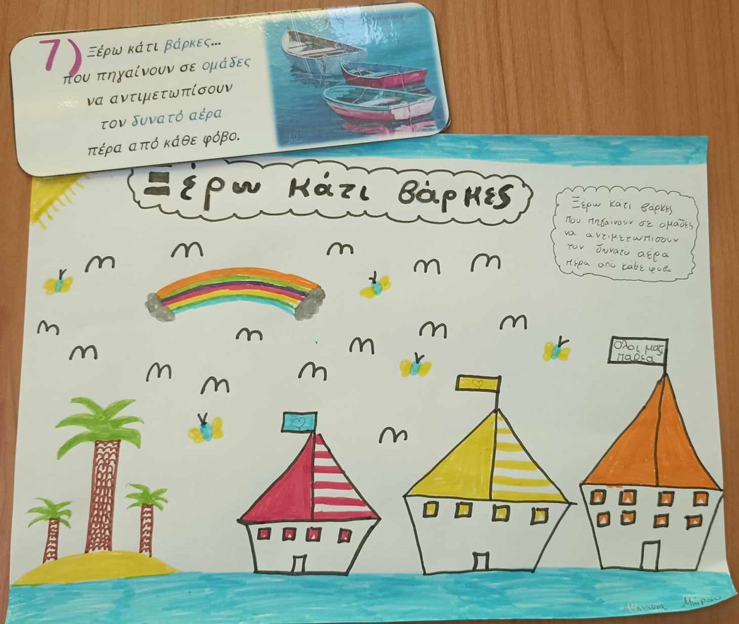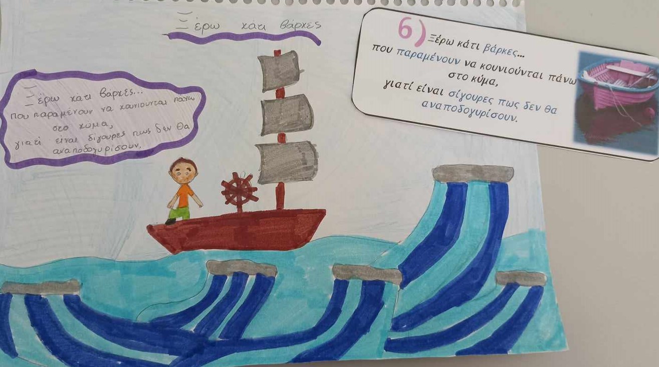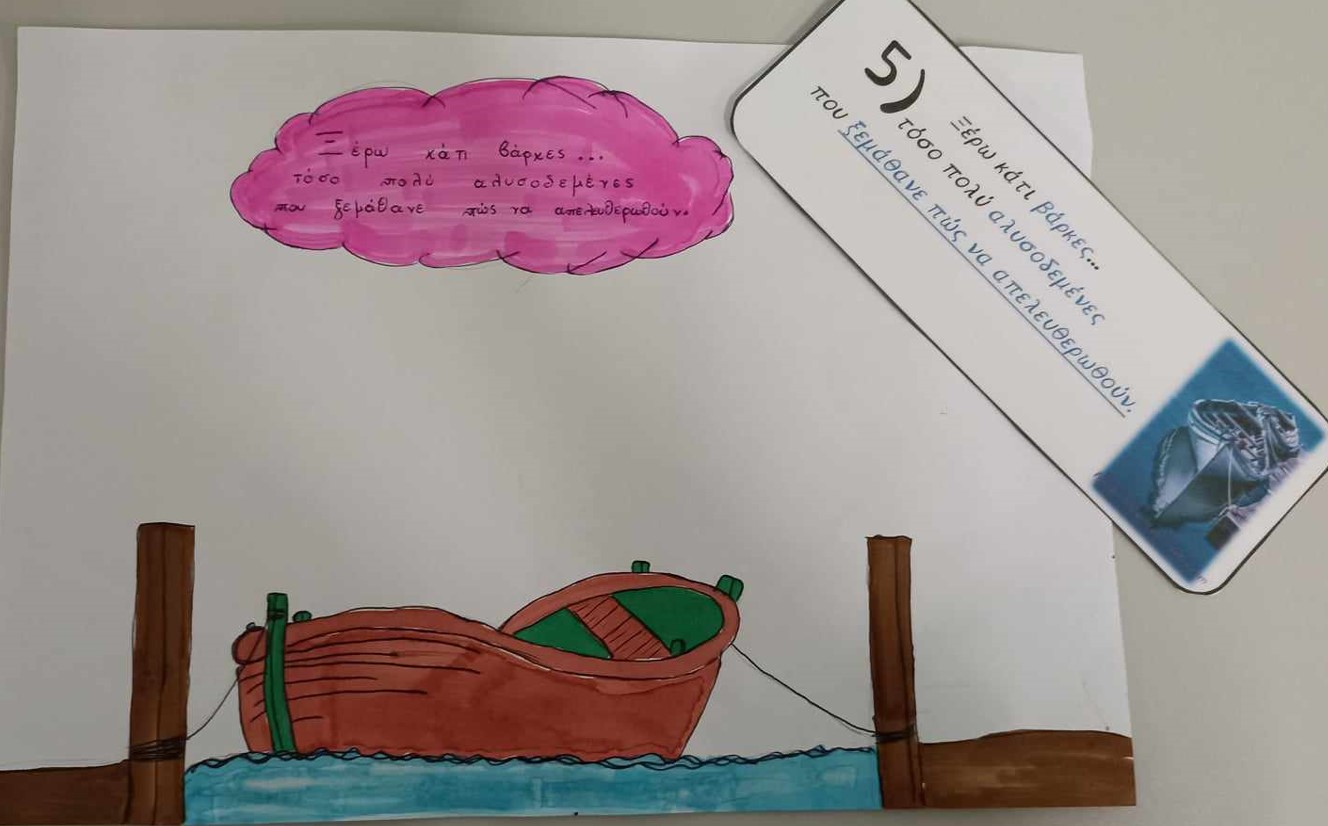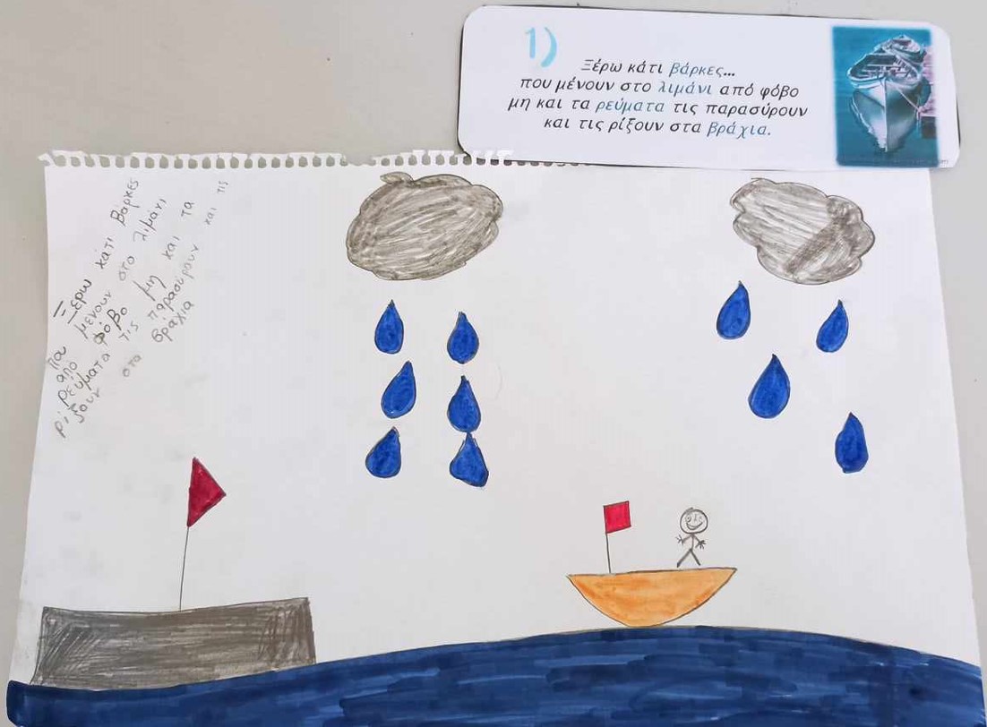 Οι μαθητές/ριες διάβασαν το ποίημα "Ξέρω κάτι Βάρκες" του Jacques Brel, άκουσαν τη μελοποιημένη εκδοχή του και συζήτησαν αναφορικά με το νόημα των στίχων του. Στη συνέχεια, ο/η καθένας/μία επέλεξε τυχαία μια στροφή και ζωγράφισε μια σχετική εικόνα. Πάνω στη ζωγραφιά έγραψαν τους στίχους της στροφής τους. Στο τέλος, ο/η καθένας/μία απήγγειλε τη στροφή του/της και το μαγνητοσκοπήσαμε, προκειμένου να δημιουργήσουμε ένα συνολικό βίντεο.