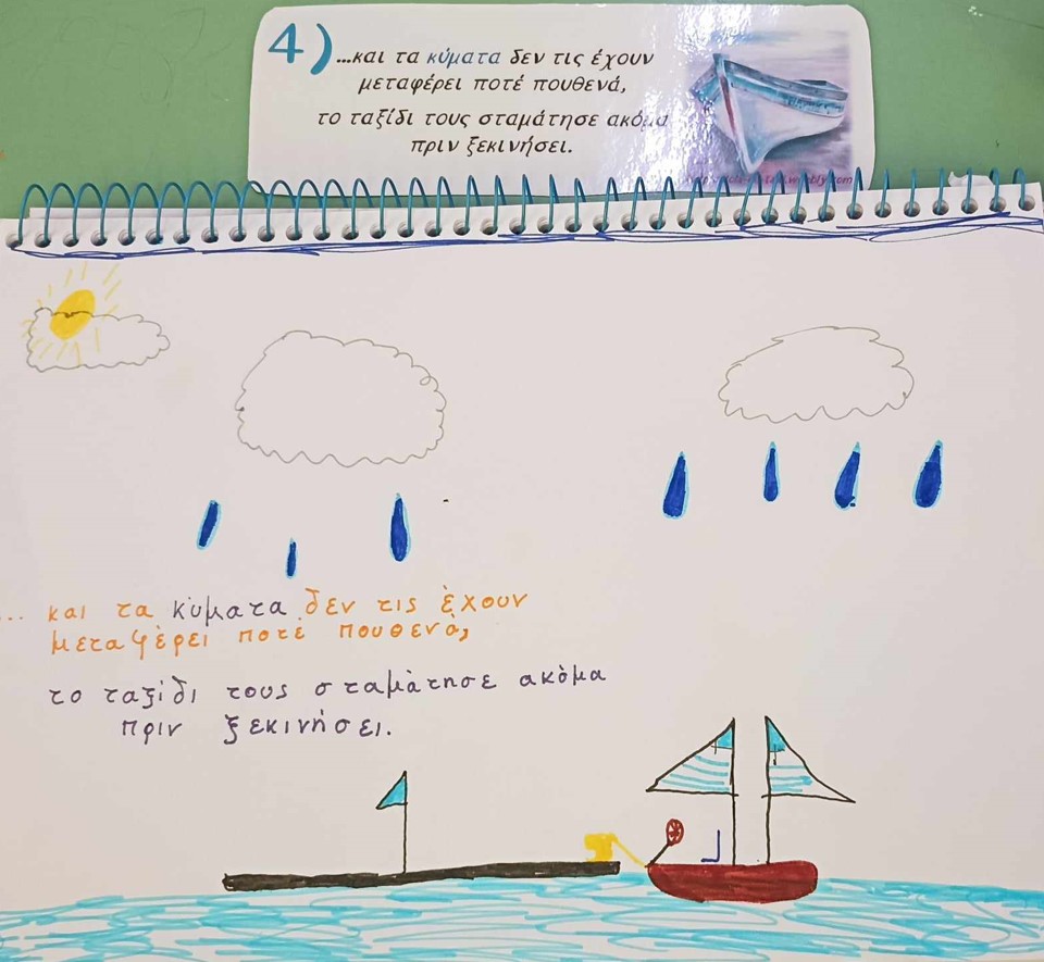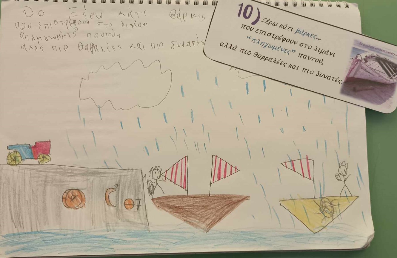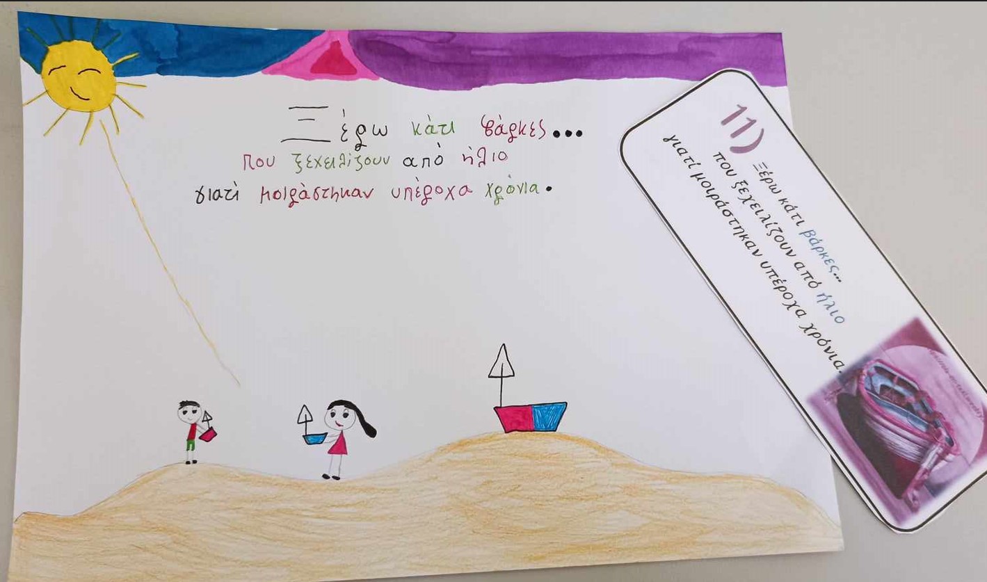 Οι μαθητές/ριες διάβασαν το ποίημα "Ξέρω κάτι Βάρκες" του Jacques Brel, άκουσαν τη μελοποιημένη εκδοχή του και συζήτησαν αναφορικά με το νόημα των στίχων του. Στη συνέχεια, ο/η καθένας/μία επέλεξε τυχαία μια στροφή και ζωγράφισε μια σχετική εικόνα. Πάνω στη ζωγραφιά έγραψαν τους στίχους της στροφής τους. Στο τέλος, ο/η καθένας/μία απήγγειλε τη στροφή του/της και το μαγνητοσκοπήσαμε, προκειμένου να δημιουργήσουμε ένα συνολικό βίντεο.