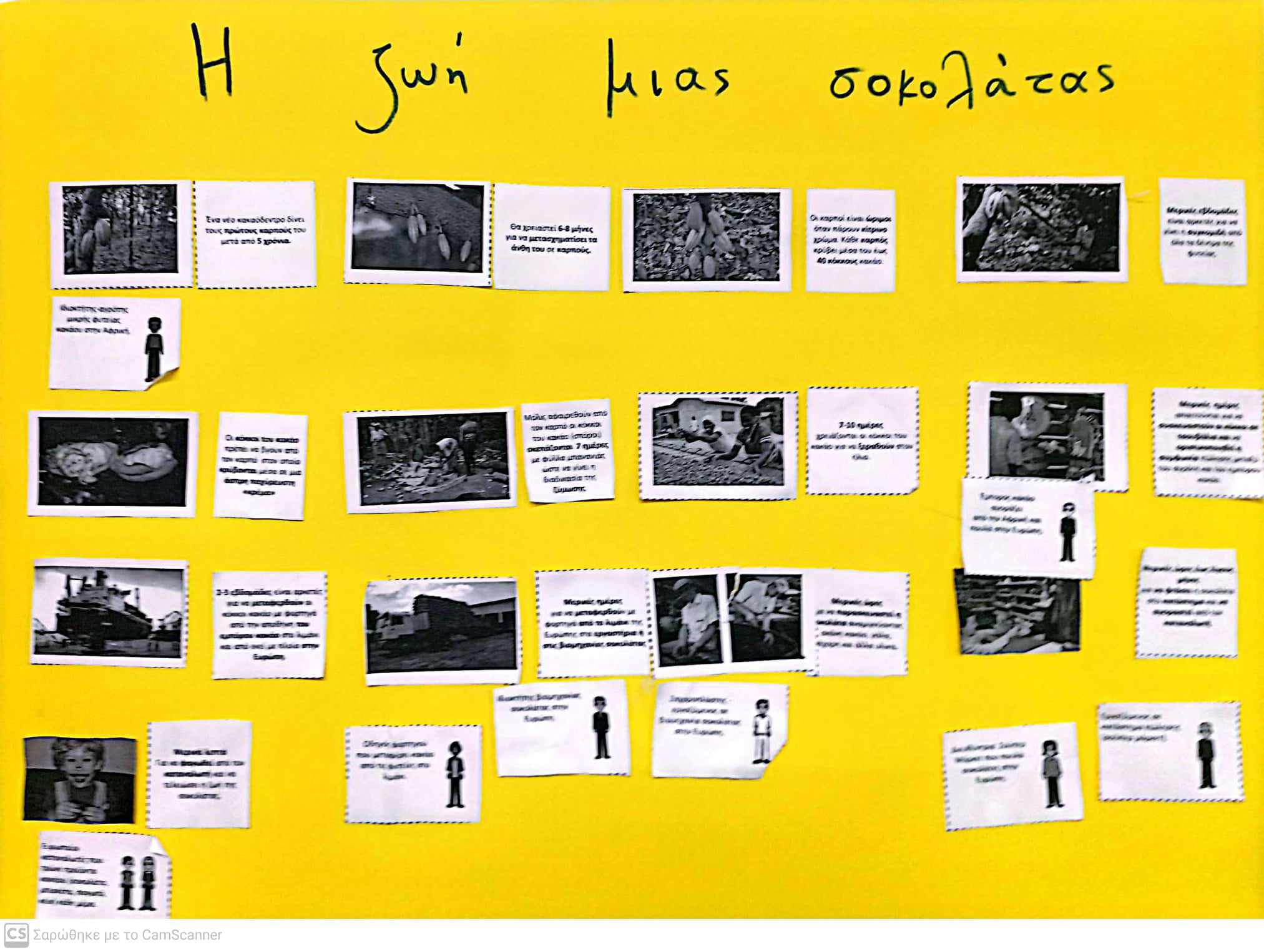 Έπειτα, τα παιδιά γνώρισαν την αλυσίδα παραγωγής και κατανάλωσης μιας σοκολάτας και δημιούργησαν ομαδικά μια ιστοριογραμμή με φωτογραφίες. Επιπλέον, χωρίστηκαν σε ομάδες και διάβασαν κείμενα σχετικά με το Δίκαιο Εμπόριο και τους τρόπους με τους οποίους δύναται να βελτιωθεί η ζωή στις αναπτυσσόμενες χώρες. Παρακολούθησαν βίντεο για τους 17 Παγκόσμιους Στόχους και συνεργατικά προσπάθησαν να ανακαλύψουν τη σχέση των 17 Παγκόσμιων Στόχων με το Δίκαιο Εμπόριο και το Παγκόσμιο Εμπόριο.
