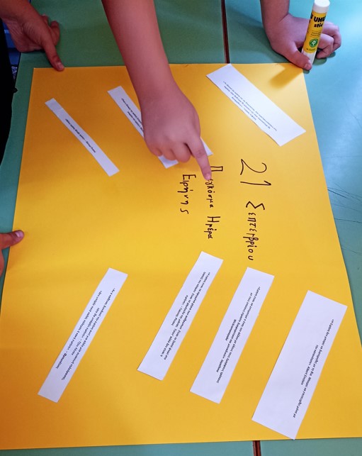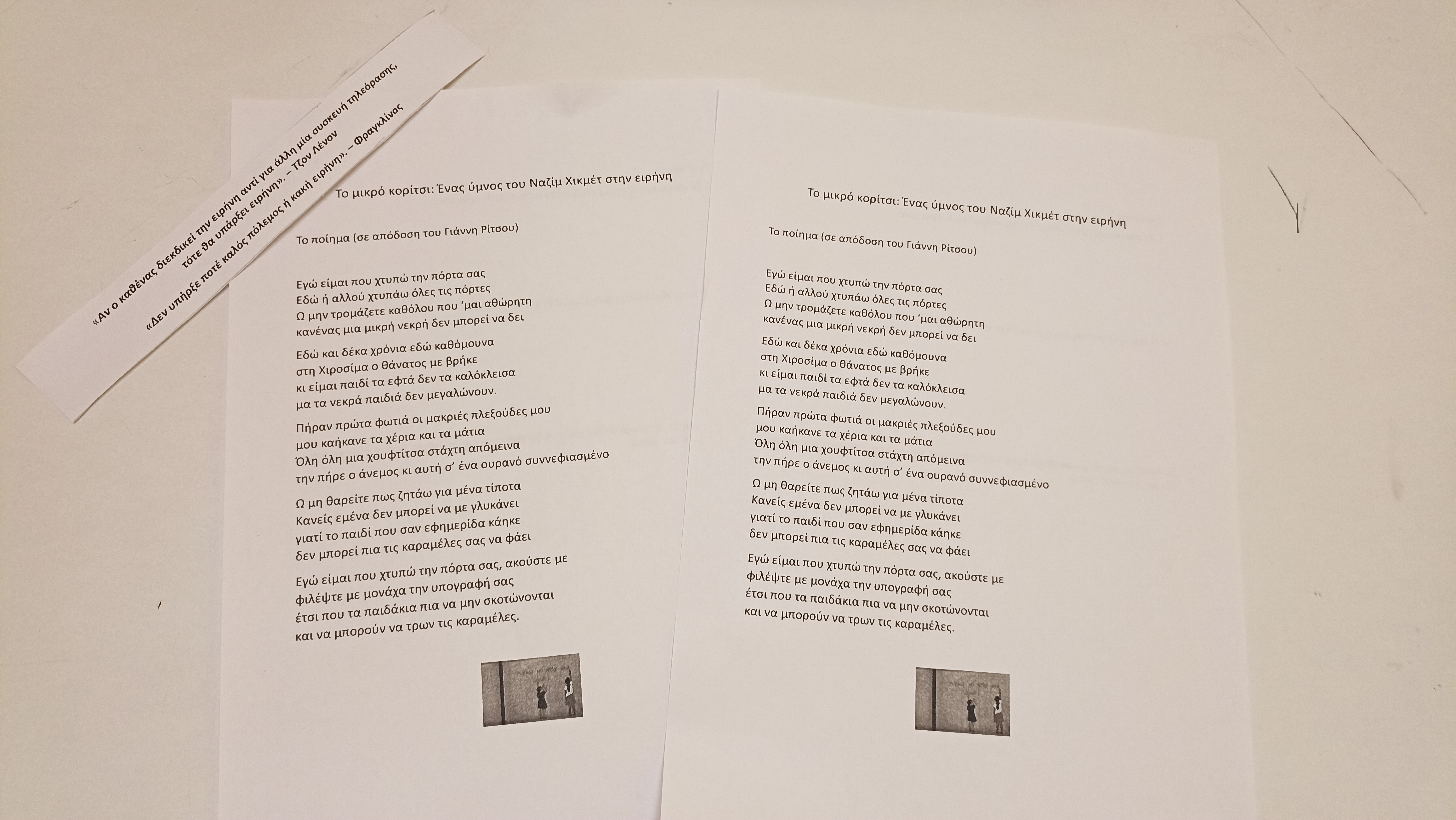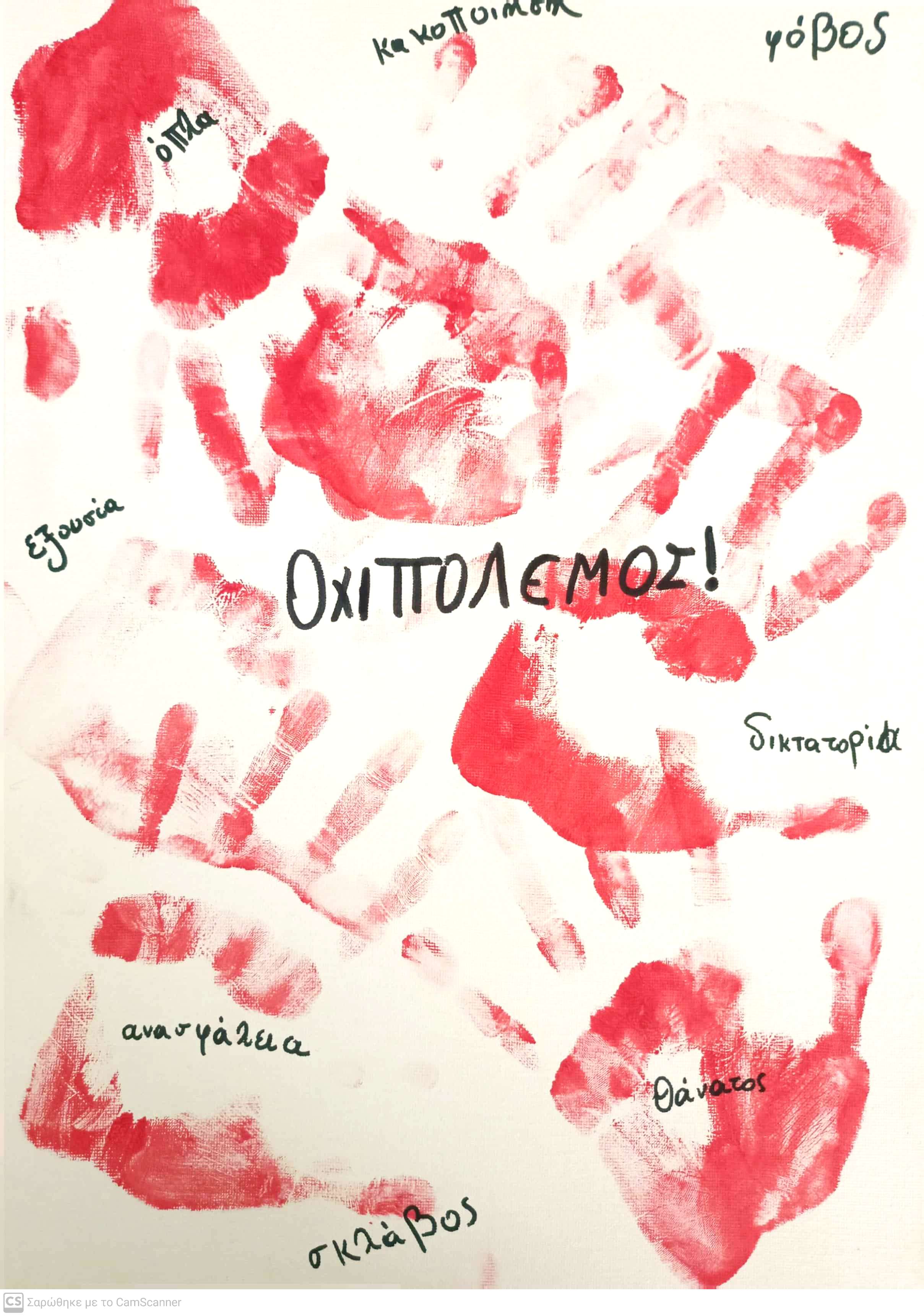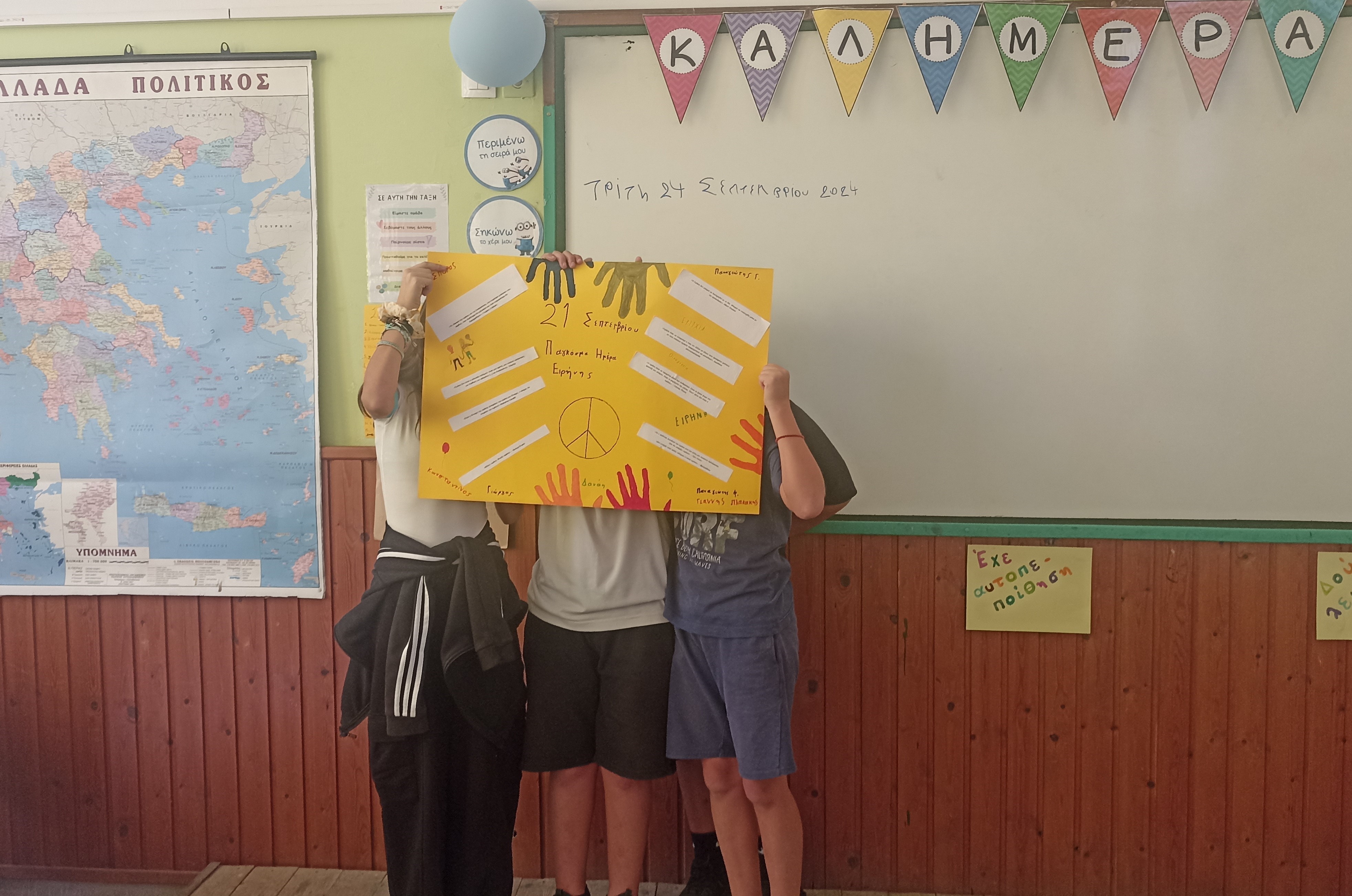 Η Στ' τάξη, με αφορμή την Παγκόσμια Ημέρα Ειρήνης στις 21 Σεπτεμβρίου, συζήτησε για τα θετικά της ειρήνης και για τους κινδύνους του πολέμου. Αρχικά, τα παιδιά παρακολούθησαν την ταινία μικρού μήκους "Ο πόλεμος δεν είναι παιχνίδι". Στη συνέχεια, μίλησαν για τη ζωή και το έργο του ποιητή της ειρήνης, Ναζίμ Χικμέτ και διάβασαν το ποίημά του με τίτλο: "Το μικρό κορίτσι". Επίσης, προσπαθώντας να χτυπήσουν την πόρτα των γύρω τους, όπως γράφει και ο Ναζίμ Χικμέτ, και να διαδώσουν το μήνυμα της ειρήνης, προχώρησαν σε ανάγνωση του παραπάνω ποιήματος και σε ηχογράφησή του. Τέλος, τα παιδιά ζωγράφισαν για την ειρήνη και δημιούργησαν μια αφίσα ομαδικά.