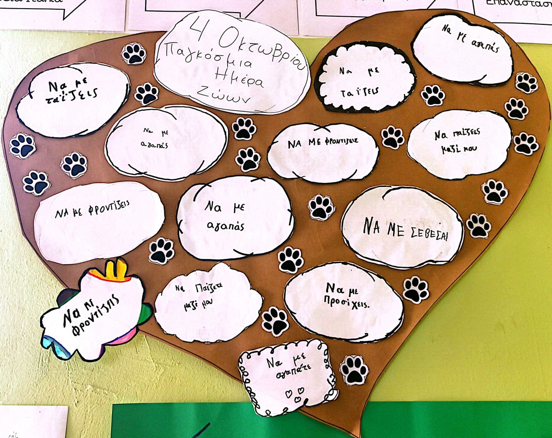 Τα παιδιά της Στ' τάξης, με αφορμή την παγκόσμια ημέρα ζώων, συζήτησαν για τα δικαιώματα των ζώων και τις ανάγκες τους. Στη συνέχεια, έφτιαξαν μία αφίσα για να τονίσουν τη σημασία της φροντίδας και της προστασίας των ζώων από τους ανθρώπους.