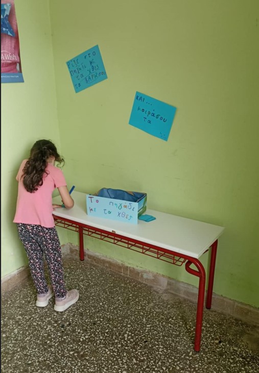 Στο τέλος, παρουσίασαν το πηγάδι τους στις υπόλοιπες τάξεις του σχολείου και παρότρυναν τους/τις συμμαθητές/ριες τους να ρίξουν μέσα και οι ίδιοι/ες τις δικές τους λύπες, ανησυχίες και αγωνίες.