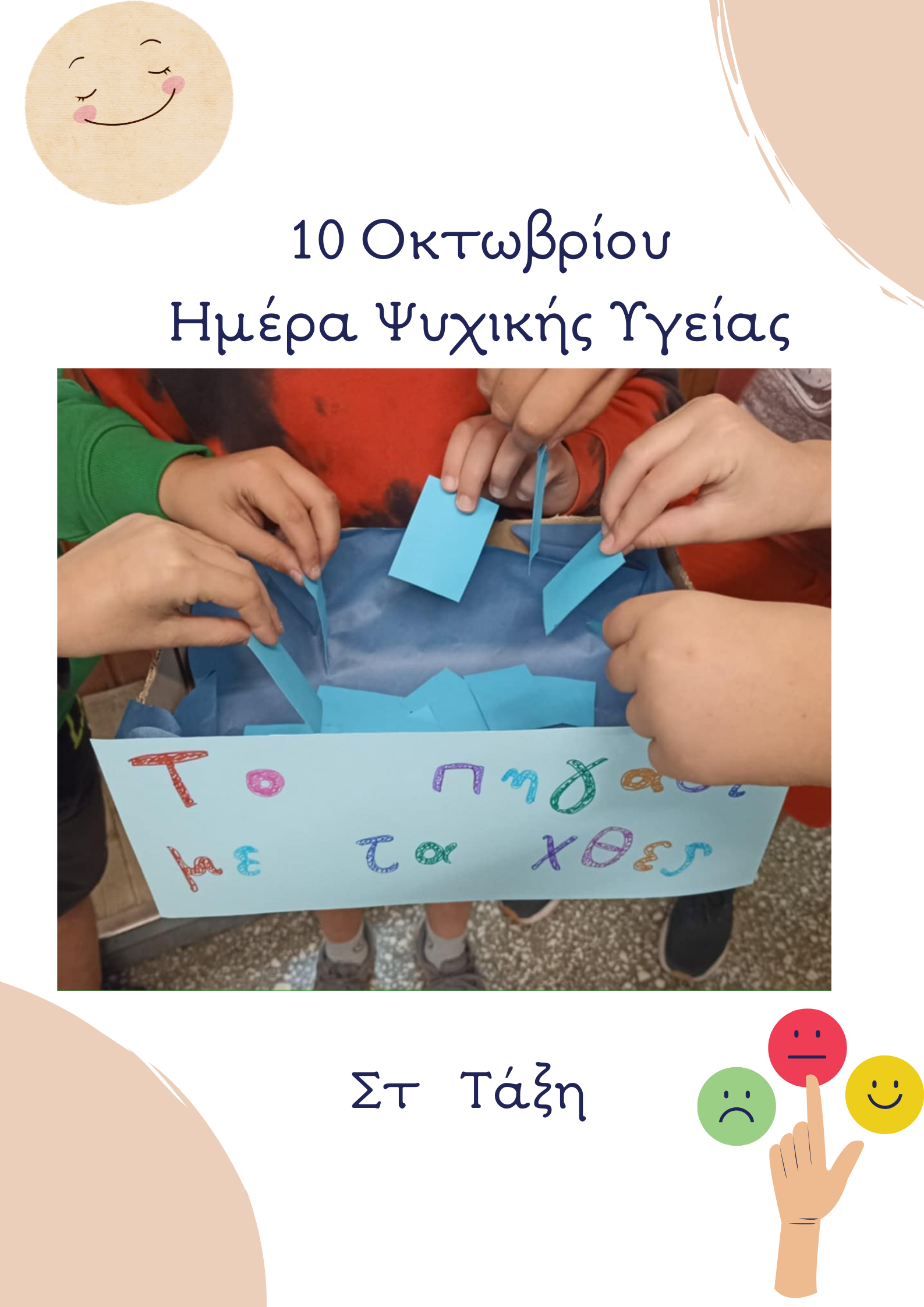 Τα παιδιά της Στ' τάξης, με αφορμή την Παγκόσμια Ημέρα Ψυχικής Υγείας, διάβασαν το παραμύθι "Το πηγάδι με τα χθες" και συζήτησαν για τις ψυχικές διαταραχές, τον ρόλο του/της ψυχιάτρου και τη σημασία της ψυχικής υγείας. Επιπλέον, μίλησαν για το ''στίγμα" και τα στερεότυπα που συνοδεύουν τα θέματα της ψυχικής υγείας, σε μια προσπάθεια να σταθούν κριτικά απέναντι τους και να τα αποδομήσουν.