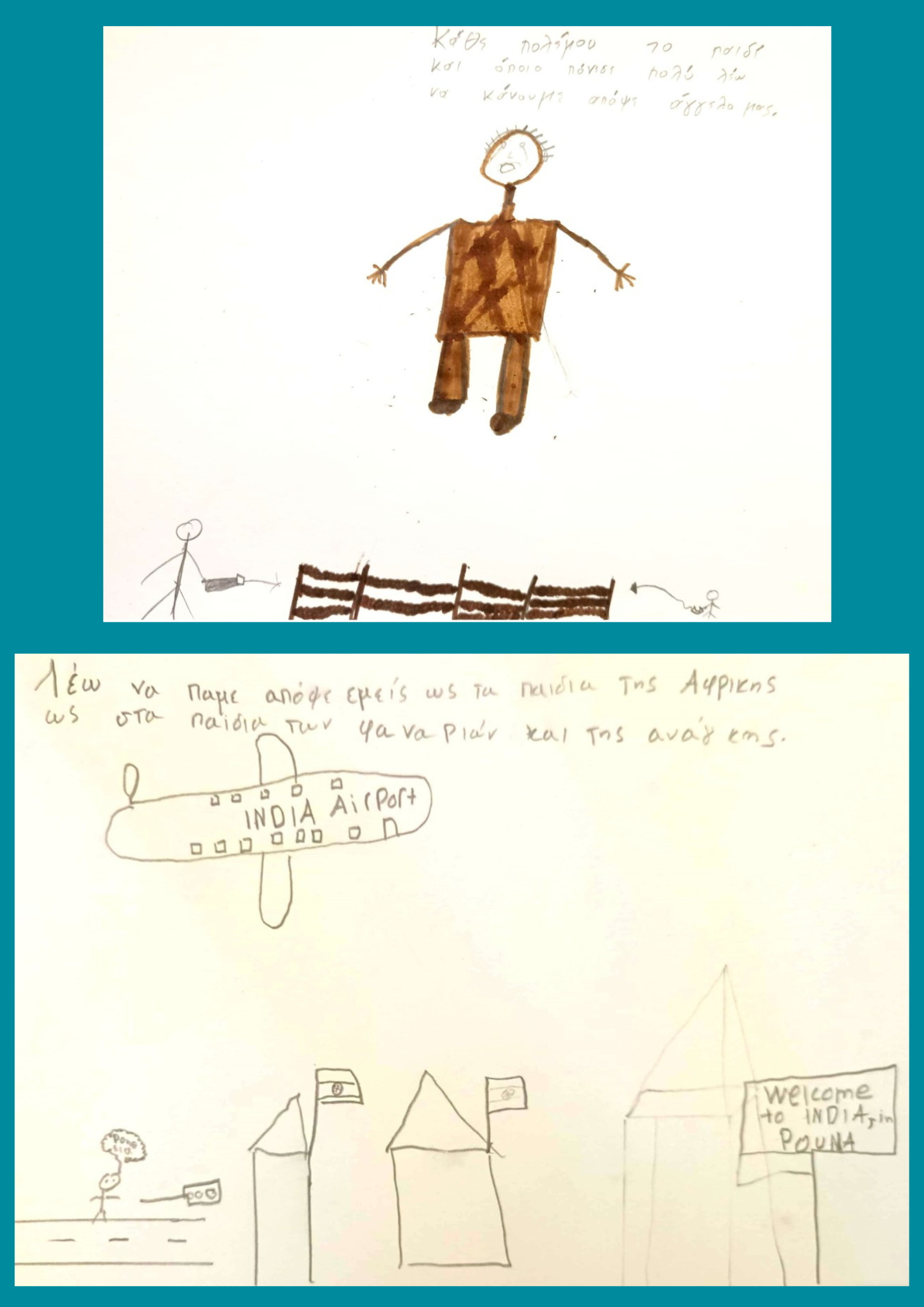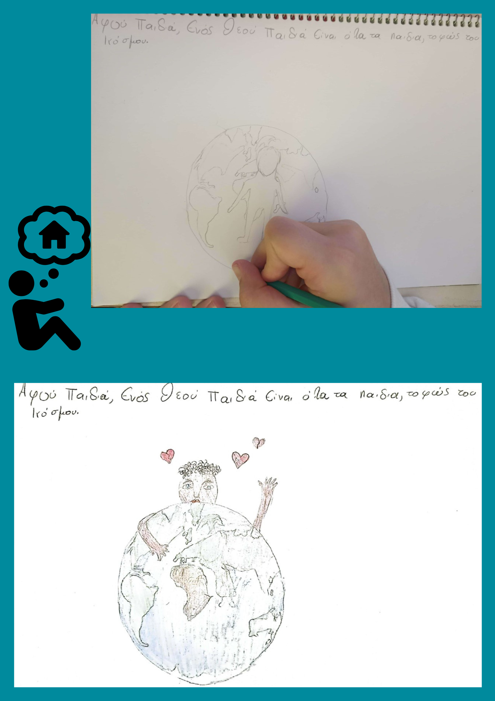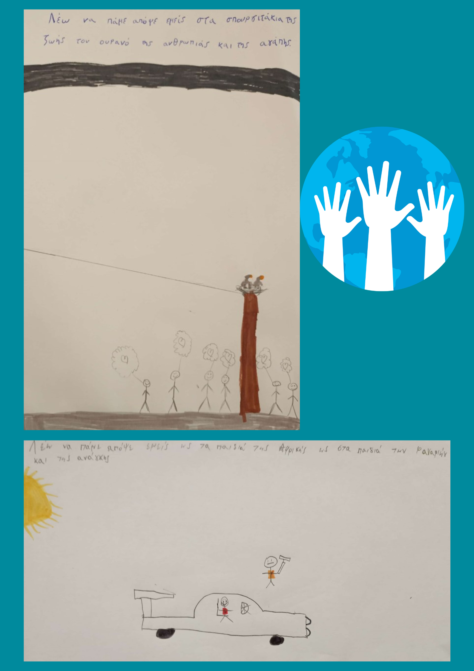 Με αφορμή την Παγκόσμια Ημέρα για τα Δικαιώματα του Παιδιού στις 20 Νοέμβρη, η Στ' Τάξη άκουσε το τραγούδι "Ενός Θεού Παιδιά", (της Παιδική Χορωδίας του Σπύρου Λάμπρου σε συνεργασία με Τζωρτζίνα Καραχάλιου και Κώστα Καραφώτη) και συζήτησε για τα θέματα που θίγει. Οι μαθητές/ριες μίλησαν για τα παιδιά-στρατιώτες, τα παιδιά "των φαναριών", της Αφρικής και γενικότερα για τα εκείνα που βρίσκονται σε ανάγκη. Στη συνέχεια, απάντησαν σε ερωτήσεις σχετικά με τα μηνύματα του τραγουδιού και δημιούργησαν τις δικές τους ζωγραφιές, εμπνευσμένες από τους στίχους.