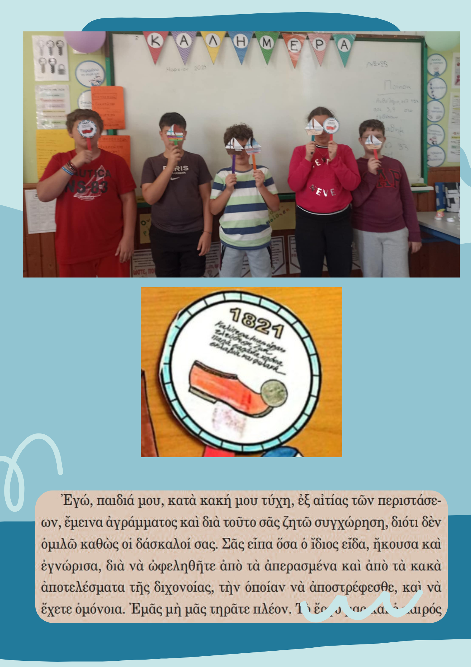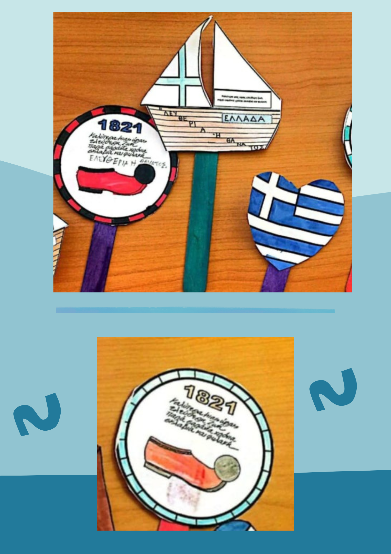 Οι μαθητές/ριες της Έκτης τάξης συζήτησαν για την επέτειο της επανάστασης του 1821. Παρακολούθησαν βίντεο, ώστε να θυμηθούν τα σημαντικότερα γεγονότα, άκουσαν τον λόγο που είχε εξαγγείλει ο Κολοκοτρώνης στην Πνύκα και διάβασαν το ποίημα "Ελεύθεροι Πολιορκημένοι" του Διονύσιου Σολωμού. Επιπλέον, ο/η καθένας/μία βρήκε πληροφορίες για τη ζωή ενός/μιας ήρωα/ίδας και τις διάβασε στην ολομέλεια της τάξης, χωρίς να αναφέρει το όνομα, προκειμένου οι υπόλοιποι/ες να προσπαθήσουν να το μαντέψουν. Στο τέλος, ζωγράφισαν τα δικά τους καραβάκια που οδηγούν την Ελλάδα στην ελευθερίΕκπαιδευτικός:Δέσποινα Καπαρινού