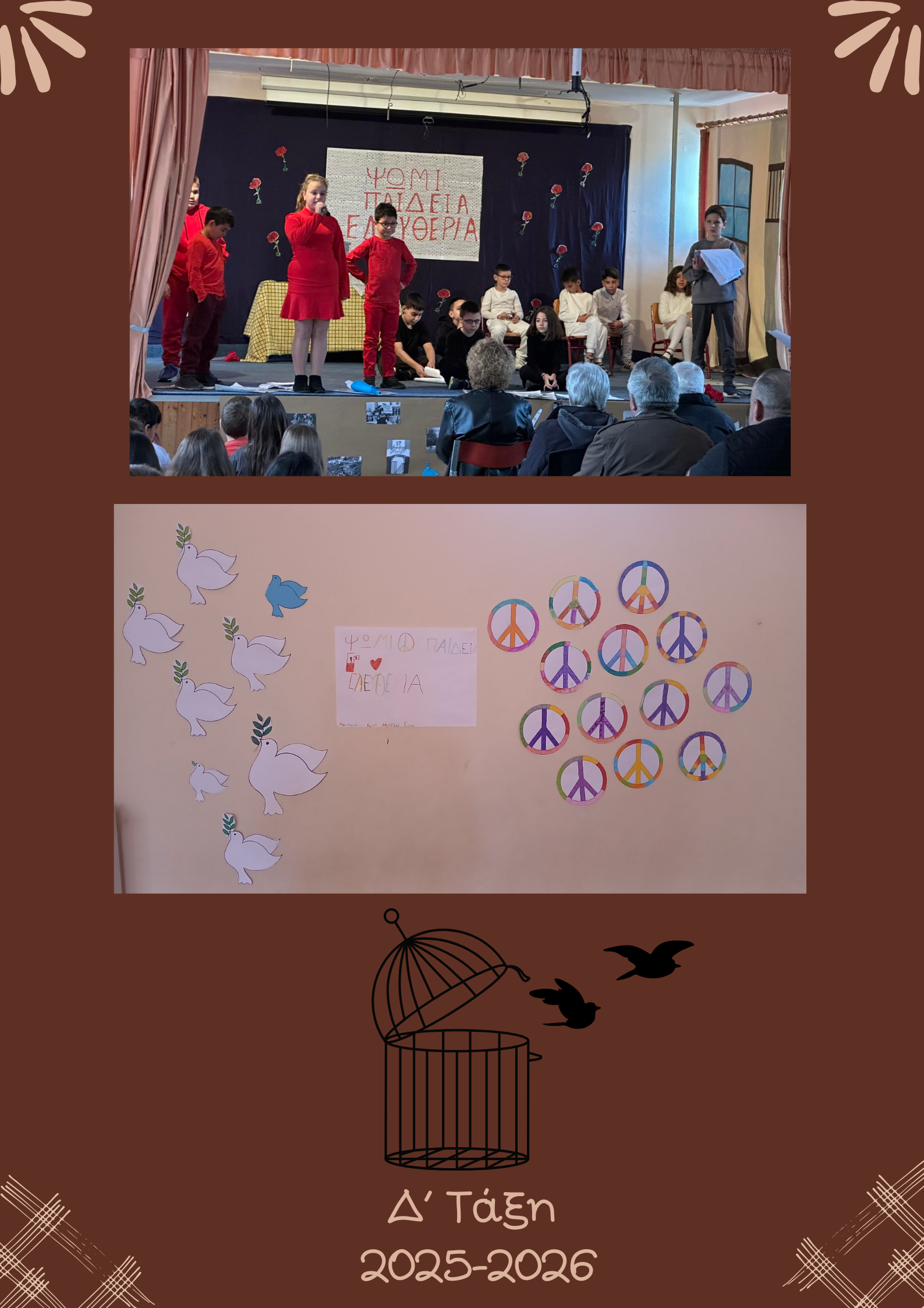 Οι μαθητές της Δ΄ Τάξης με τη δασκάλα τους κα Ευαγγελία Σακελλάρη παρουσίασαν ένα θεατρικό, που αποτέλεσε τον κορμό της γιορτής και το οποίο πλαισιώθηκε με τραγούδια, κείμενα και ποιήματα.